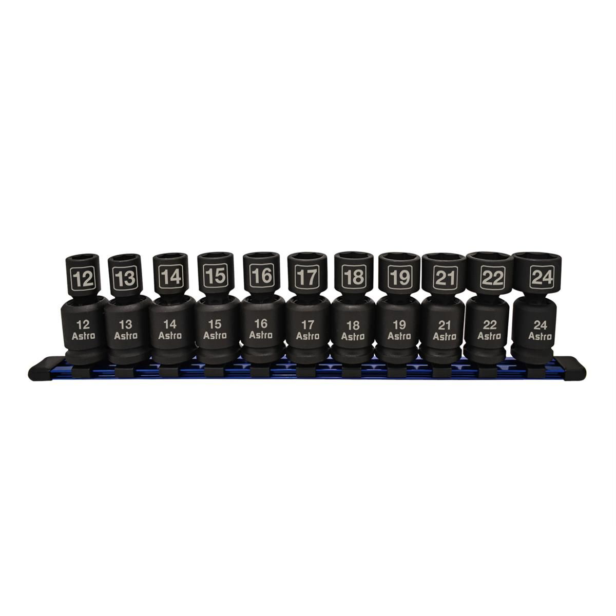 The Astro Pneumatic Tool 78244 11-Piece 1/2" Drive Nano Pinless Universal Impact Sockets - Metric are made from CRO-MO with lifetime warranty. The pinless design in these sockets allow for a full 360°of freedom for the universal head to angle and rotate. As a result, the new hex ball swivel design takes more abuse than the "winged" designs by transferring more of the impact force to the bolt itself. This set includes one aluminum socket holder and pinless universal impact sockets in the following sizes: 12mm, 13mm, 14mm, 15mm, 16mm, 17mm, 18mm, 19mm, 21mm, 22mm, 24mm.