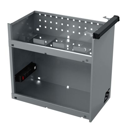 Power tool drawer with power strip includes four electric outlets and two USB ports to efficiently store, organize, and charge power tools in one place. Top till includes full-extension gas struts and a lockable security compartment with an additional power strip to store and charge phones, laptops, and other devices. Four (4) 5x2 inch casters with a weight capacity of 520 lbs each: two (2) swivel locking, two (2) swivel. Equipped with HMC High Security Locking System to keep valuables safe and secure. Heavy-duty rubber grip push handle provides comfortable grip and easy maneuverability. Durable stainless steel worksurface. Full-length black aluminum contoured, scoop-style lift latch drawer pulls prevent drawers from opening and provides hassle-free access to tools. Nine (9) drawers with replaceable ball-bearing slides have a 100 lb weight capacity per slide pair. Non-slip PVC foam drawer liners and top mat to keep tools stationary. Constructed from 18 gauge steel. Bold UV protective high gloss powder coat finish provides a sleek look to the overall design. Backed with an Exclusive Limited 5 Year Warranty.