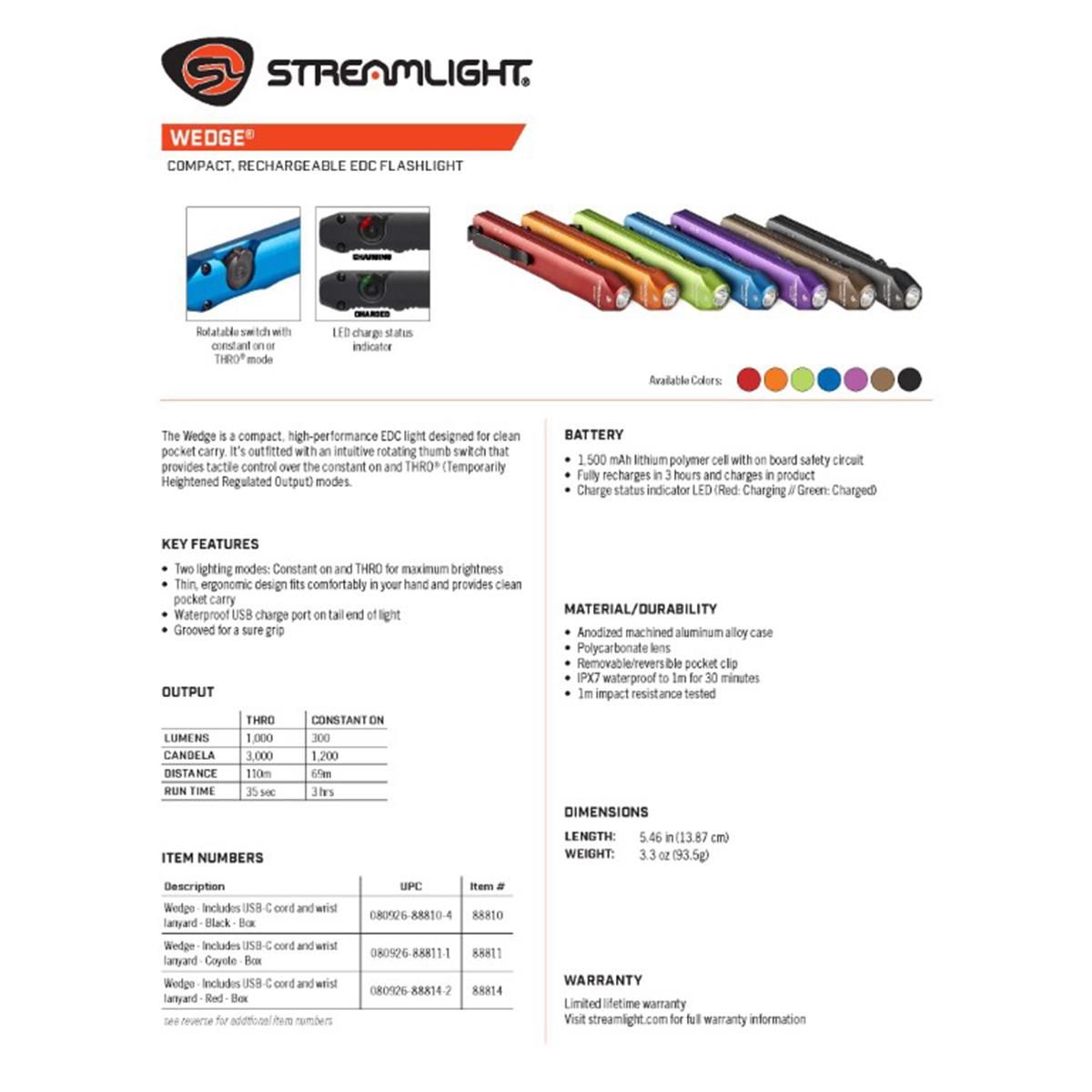 Streamlight Wedge Rechargeable EDC 300 Lumen Flashlight with 1000 Lumen Thro mode